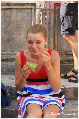 Nous avions prévu de dîner dans la ville, mais la chaleur et la fatigue nous auront fait rentrer par le bateau de 17h45, ce qui nous laissera le temps d'une petite baignade avant le repas.