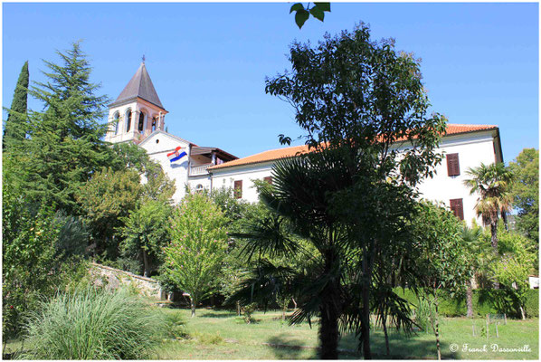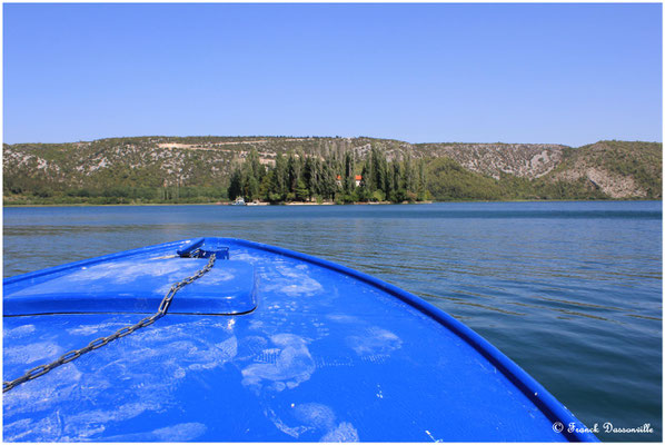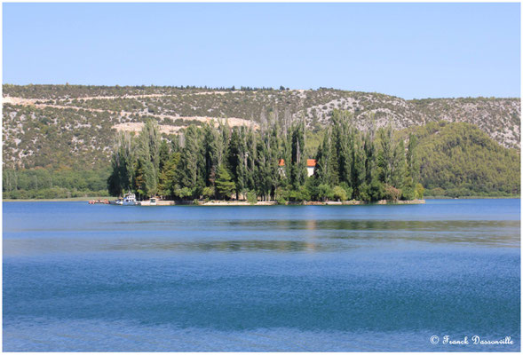 Nous pique-niquons sur place, prenons une petite pivo au bar... puis n'ayant pas de bateau, on décide de prendre Martin pour aller à Visovac par la route ! Grace à une petite voie sans issue nous arrivons au bord de l'eau. Un papy en barque motorisé y attend les touristes potentiels et nous propose de nous amener sur l'île pour 10 kn par personne... Affaire conclue, nous voilà donc sur l'eau et après quelques minutes de "navigation" nous débarquons sur l'îlot qui abrite le monastère franciscain. En ce 15 août, le monastère et le musée sont fermés, mais ces lieux paisibles sont très agréables.