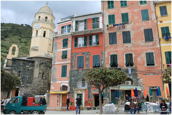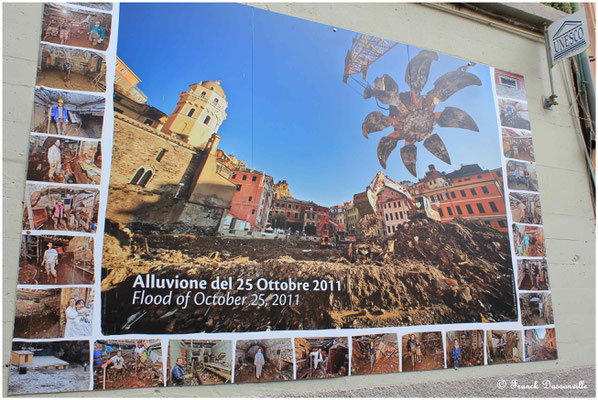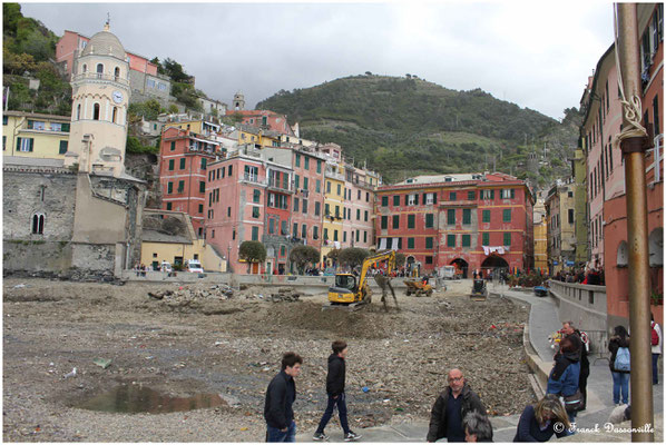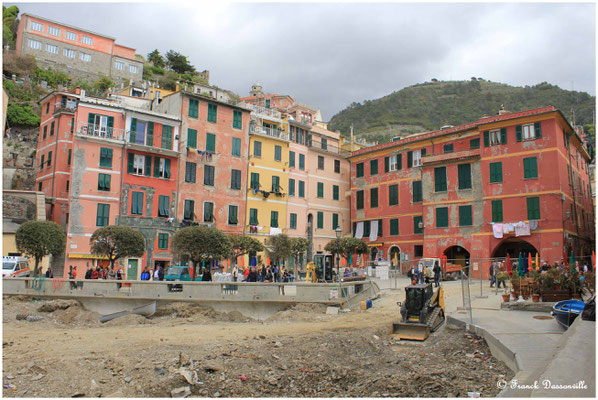 Reprise du train (les sentiers intermédiaires étant fermés) pour Vernazza. Là, ce qui a du être un superbe village est aujourd'hui bien ravagé par les inondations d'octobre 2011 : la plage et toutes les habitations et commerces proches ont été détruits, et c'est encore actuellement le ballet des pelleteuses pour débarrasser les traces de cette catastrophe.